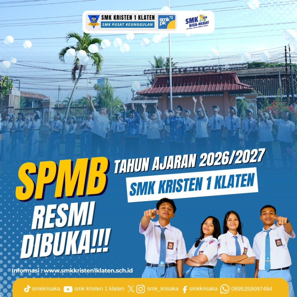 Rabu, 1 Oktober 2025 telah resmi dibuka Sistem Penerimaan Murid Baru SMK Kristen 1 Klaten Tahun Ajaran 2026/2027. Upacara pembukaan SPMB ini diikuti oleh seluruh warga SMK Kristen 1 Klaten dan perwakilan dari Yayasan Pendidikan Kristen Klaten. Sebagai tanda telah dibukanya SPMB dilakukan pelepasan balon oleh Kepala Sekolah, Guru Karyawan, Perwakilan YPKK, dan OSIS KRISAKA sebagai perwakilan siswa.